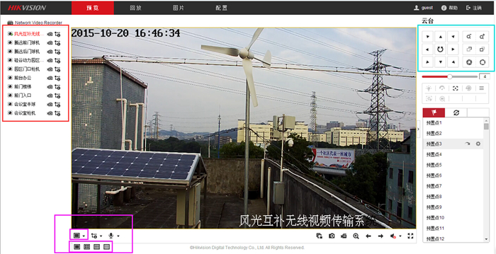 3、点击右侧蓝色框内的按键,能控制监控摄像头的转向,方向键中间的按键是自动旋转键。