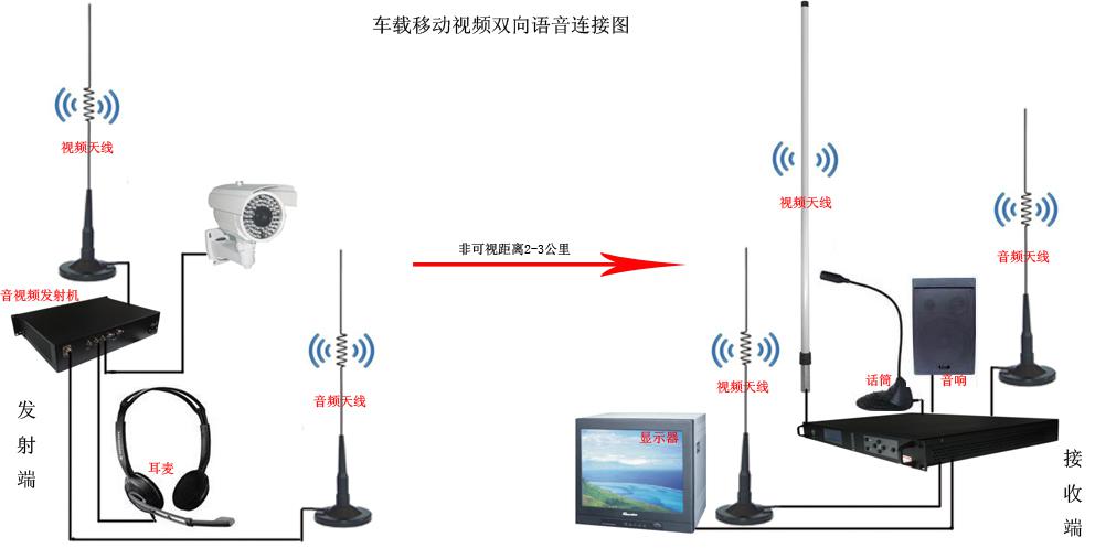 前端无线发射设备,接摄像机,监看靶场情况;接耳麦,为现场人员和指挥中心通话,接受命令。发射机接视频吸盘天线,传输视频信号;接音频吸盘天线,实现双向通话。