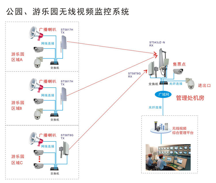 针对园区大范围、复杂环境的特点,常用5.8G无线网桥(如ST58T8G、ST5817H、ST543JZ-N等型号)作为核心传输设备,负责音视频数据的高效发送与接收。设备通过网线或光纤连接交换机,构建稳定的传输网络。
