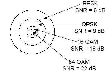 图七覆盖半径与SNR/调制方式对应关系